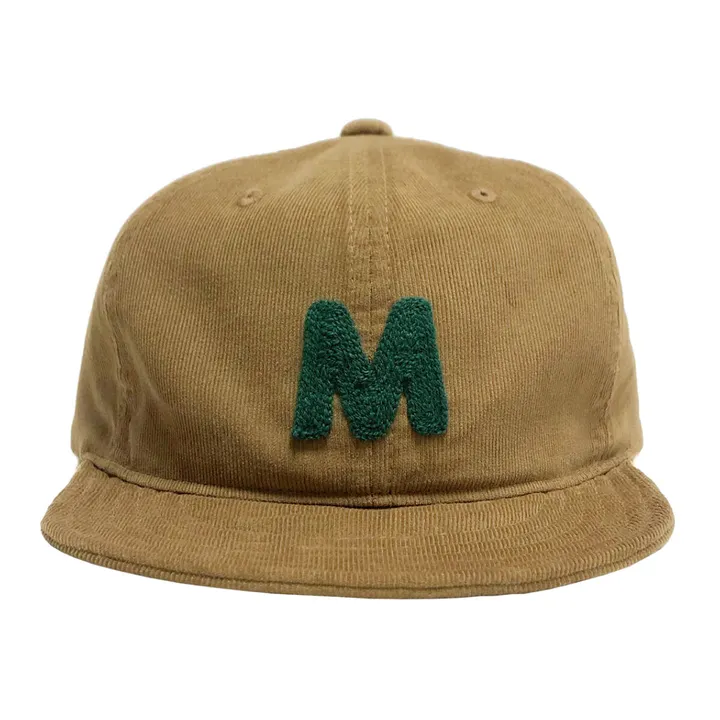 チェーン刺繍のアルファベットロゴ。コーデュロイ素材のショートつばキャップ。ストリートの遊び心を感じるベースカラーに沿ったロゴ配色の帽子。
