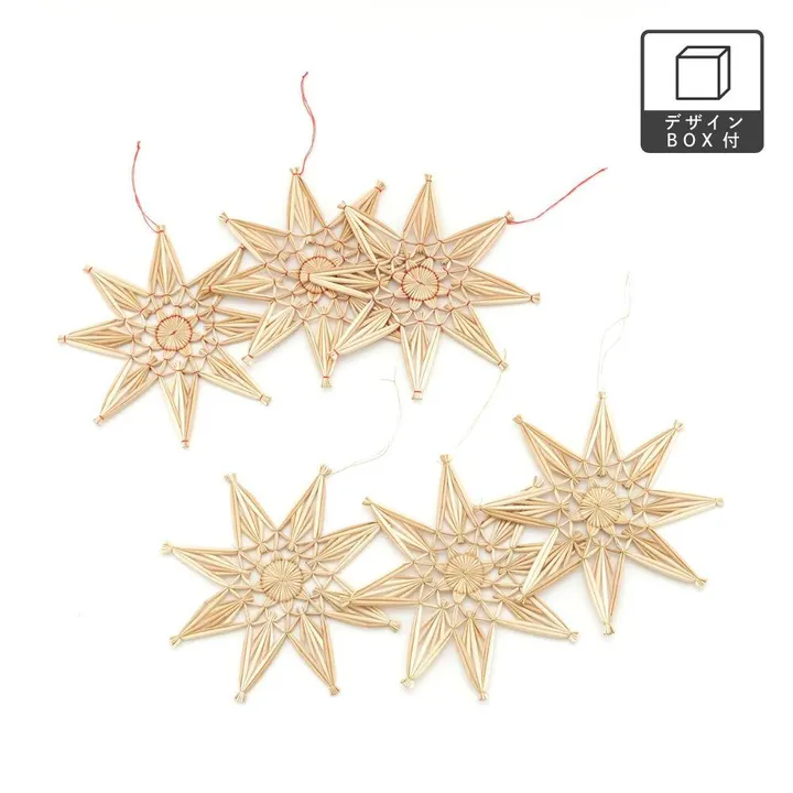 ストロー(麦わら)で作られた星型のオーナメント。 ひとつひとつ職人の手でハンドメイドされているのでそれぞれに表情があるような愛らしさが魅力です。 大ぶりサイズなのでツリーだけではなく、フックに掛けて壁に吊るしたり、空間に飾っても楽しめます。 軽いのでマグネットで玄関に飾ったりしても◎ *天然素材の風合いを活かした製品になっていますので、色の濃さにバラつきがあり、手作りのため商品のサイズや形状にも多少の誤差があります。