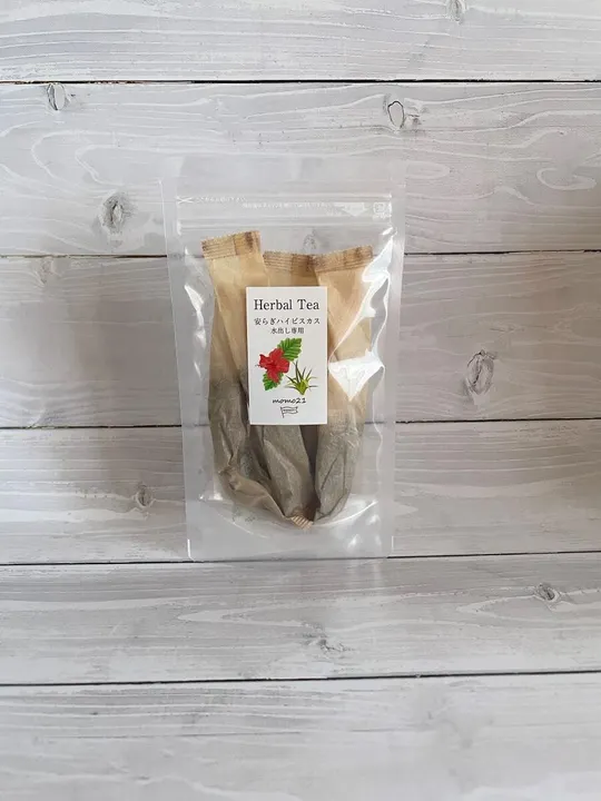 夏の限定品でしたが好評なため、継続販売中! ついに再販決定! 人気の水出しブレンドハーブティー! 見た目もルビーカラーで癒されるハイビスカスは、運動後、毎日の疲れの癒しブレンドティーにピッタリ。 抗酸化作用のおかげで、お肌にもプラス! ハイビスカスの酸味と爽快なレモングラスのブレンドで、とてもすっきりした味わいに。 レモングラスやペパーミントなど全5種のハーブをブレンドした贅沢品です。 ペパーミントが、のど越しに爽快感を味わせてくれ、疲れたからだと心を安らげてくれます。 とても爽快に飲めるオススメブレンドハーブティー! 1包でたっぷり作れるのでマイボトルで飲んでもいいですね! ※数量限定販売品です! 【原材料】 ハイビスカス【エジプト産】、レモングラス、ステビアリーフ、ローズヒップ 【内容量】 ティーバッグ5包入り ※500mLのお水に対し1包使用(茶葉5g/1包) 【賞味期限】 2027年6月 【効能】 アンチエイジング・抗酸化作用・むくみ・疲労回復・整肌・疲れ目・免疫力UP 【おいしい煎れ方】 ※500mLのお水に対し1包使用(茶葉5g/1包) 容器にティーバッグ1包を入れ、500mLの水を注ぎ、フタをして冷蔵庫で6~8時間は置いてください。 ※500mLペットボトルにティーバッグをそのまま入れて冷蔵庫で保管するのが簡単です。 容器を軽く揺らしながら混ぜると、美味しさが均一になります。 ※炭酸水でつくる場合は、ふき出しにご注意ください。 私は画像にありますよう、500mLよりやや多めの水で作りました。 つけておくほど味が濃くなります。 ティーバッグは入れっぱなしでもOKです。 抽出時間はお好みにより加減してください。 【保存方法】 高温多湿を避け、開封後はお早目にお召し上がりください。 特に夏場は開封後は必ずチャックを閉めて冷蔵庫などの涼しい場所で保管し、早めにお召し上がりください。 ※在庫数については数日お時間いただく場合もあります。  記載在庫数より多くご希望の場合は、購入後メッセージでご相談ください。
