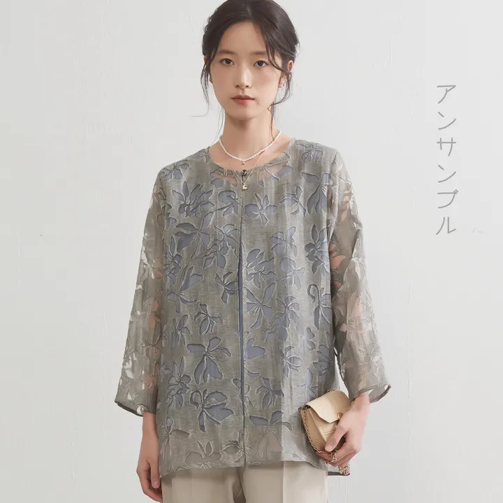 商品特徴 繊細な花柄オパールシアー素材を使用した軽量ジャケットと、上品な艶感を持つタンクトップのアンサンブル。エレガントな透け感と程よい光沢が、大人の洗練されたスタイルを引き立てます。軽やかで動きやすいデザインが魅力です。 生地の特徴 ジャケットは花柄オパールシアー素材で、涼しげで軽やかな着心地を提供。タンクトップは艶感のある滑らかな生地を採用し、肌に心地よくフィット。どちらも高品質な素材で仕立てられ、上品な印象を与えます。 コーディネート提案 オケージョンやオフィスシーンにはもちろん、デイリーにも使える万能アイテム。パンツと合わせてエレガントカジュアルに、スカートと組み合わせてフェミニンなスタイリングにも対応。シンプルなアクセサリーをプラスするだけで、洗練された大人のコーディネートが完成します。 単位(cm)モデル身長165cm サイズ M ジャケット:身丈 70 バスト 104 肩幅 38 袖丈 50 インナー:身丈 61 バスト 100 肩幅 37 サイズ L ジャケット:身丈 70 バスト 110 肩幅 39 袖丈 50 インナー:身丈 61 バスト 106 肩幅 38 ジャケット:ポリエステル100% インナー:ポリエステル 90% ポリウレタン10% 中国製 透け感:ジャケットあり、インナーなし 生地の厚さ:普通 光沢感:インナーあり 裏地:なし 家庭洗濯:手洗いお勧め 【注意点】 ※撮影商品はサンプルの為、実際の仕様と異なる場合がございます。 ※画像の商品は光の照射や角度、お使いのモニター環境により、実物と色味が異なる場合がございます。スタジオ物撮りの画像が実物の色味に一番近くなっております。 ※予約商品の場合、お届け予定はあくまでも目安となります。 生産の都合上、お届け時期がずれる場合がございますので、あらかじめご了承ください。 ※表記サイズは商品の実寸です。 ※布製品の特性上、サイズ表の実寸法は多少の誤差が生じる場合がございますので、予めご了承ください。
