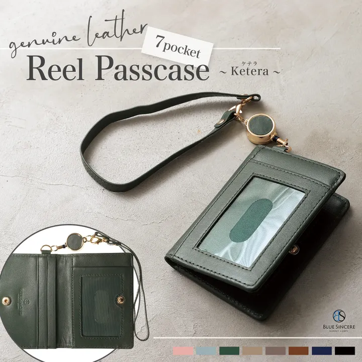 パスケース リール付き 本革 レディース 大容量 7枚 定期入れ 社員証入れ 二つ折り 中が見えない 免許証入れ カードケース / PC9 Ketera ケテラ ディープグリーン