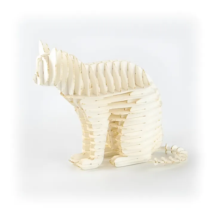 FLATS「猫段(ねこだん)」は座りポーズと立ちポーズの2種類があります。 どちらも今にも動き出しそうな猫のたたずまいを全64(80)個の部品群で表現しています。 建築の設計思想から生まれたFLATSは、一つひとつのパーツが固有のカタチと意味を持ちながら、互いに響き合い、等しい関係で全体を構成する「等価(=FLATS)」というコンセプトでかたちづくられています。猫の「たたずまい」と透明感のある造形は常にそこから生み出されています。 FLATS アニマルシリーズははさみやカッター、接着剤を使わずに組み立てる事ができます。(足など一部のパーツが極小サイズとなるのでピンセットがあると組み立て易いです) FLATSの精緻な造形による動物シリーズをお楽しみください。