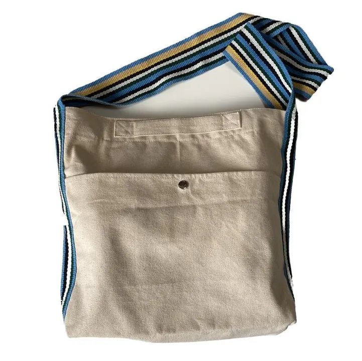 ハンセン病の療養施設で手織りしている細長い織物”ベサニーテープ”をショルダーストラップにたっぷり使用しました。ストラップの幅が7センチあるので、肩への負担が少なく、また、クロスボディーにするとベサニーテープがおしゃれポイントになります。しっかりとしたキャンバス地なので、本やPCなどを入れていただけます。スナップボタン付きの大きな外ポケット、内側には大小3つのポケットがあるのも便利です。バッグ本体のクロージャはマグネットボタンです。 この商品の詳細は、YouTube(下記のリンクから)でもご覧いただけます。 https://www.youtube.com/watch?v=9zyFgPkphL0&t=340s