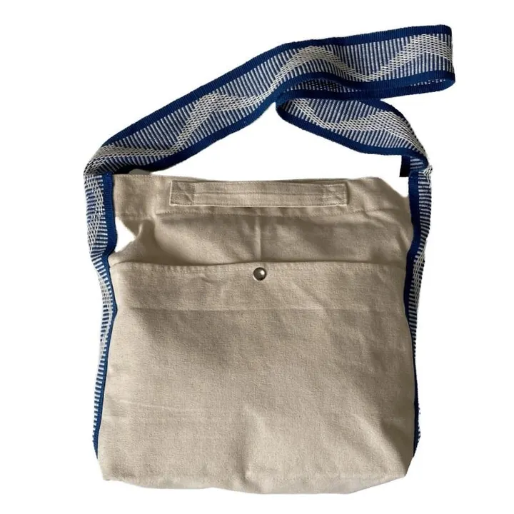 ハンセン病の療養施設で手織りしている細長い織物”ベサニーテープ”をショルダーストラップにたっぷり使用しました。ストラップの幅が7センチあるので、肩への負担が少なく、また、クロスボディーにするとベサニーテープがおしゃれポイントになります。しっかりとしたキャンバス地なので、本やPCなどを入れていただけます。スナップボタン付きの大きな外ポケット、内側には大小3つのポケットがあるのも便利です。バッグ本体のクロージャはマグネットボタンです。 この商品の詳細は、YouTube(下記のリンクから)でもご覧いただけます。 https://www.youtube.com/watch?v=9zyFgPkphL0&t=340s