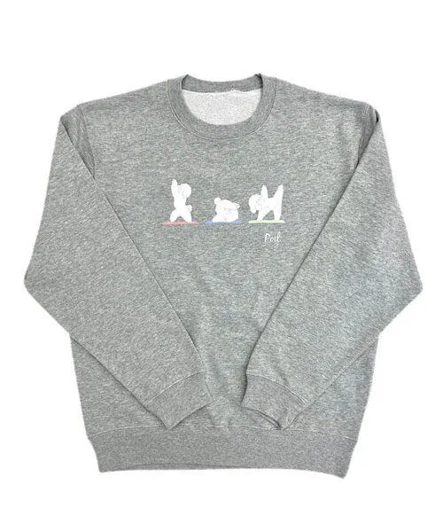 ビションフリーゼがヨガをしている様子が可愛いスウェットプルオーバーです。 三日月のポーズ-鋤のポーズ・半月のポーズを伸び伸びとしている様子を転写プリントで施しました。 インナーにタートルネックのインナーなどを着用していただければ冬の寒い時期でも着回し可能ですし、春先の肌寒い時期までお使いいただけます。 〈素材〉 10オンスの綿100%の裏毛素材を使用しています。 生地にしっかりと厚みがあるので肌寒い時期から冬の時期など、使い勝手の良い素材感です。