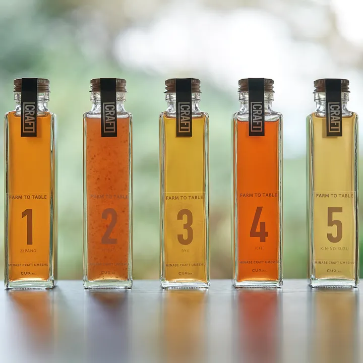 個性豊かな「みなべクラフト梅酒」のNo.1~5の5種をミニボトルでお届けします。 アルコール度数が低めのクラフト梅酒をセレクトしました。 * No.1 Alc. 10% BASE: Japanese sake 糖分を抑え、完熟南高梅の酸味と日本酒のキレが立つクセのないすっきりした味わい。 * No.2 Alc. 11% BASE: Okinawa shochu age sake あらごし果肉を泡盛古酒に漬け込み、黒糖で仕込んだ梅酒。 濃厚な甘さと泡盛古酒の香りが特徴。 * No.3 Alc. 12% BASE: Shochu 完熟南高梅をふんだんに使用し、梅の香り立つすっきりとした甘口仕上げ。 なめらかな舌触り。 * No.4 Alc. 13% BASE: Okinawa shochu 南高梅、すもも梅など3種の梅をブレンド。 沖縄の泡盛とあわせさっぱりとした口当たりに。 * No.5 Alc. 14% BASE: Shochu 砂糖を使わず、はちみつで梅のエッセンスを抽出。 ワインのようにストレートで楽しめる大人の梅酒。 150ml × 5本