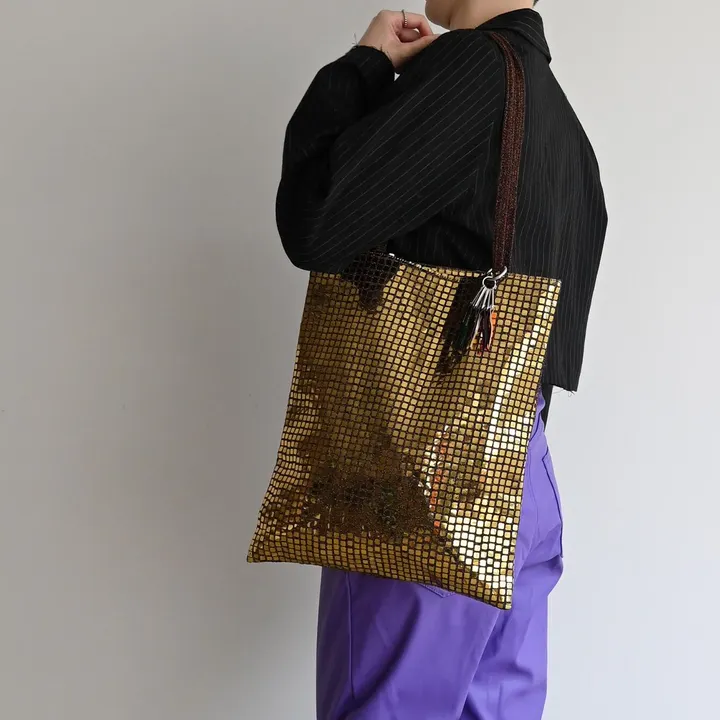 光をまとって視線をさらうトートバッグ。 ミラーボールのように輝く生地が印象的で存在感抜群! 軽やかな素材感とフラットなフォルムで、 デイリーはもちろん、パーティーにも映えるアイテムです♪ 『cheek』アイコンのヒキテチャーム付き。 取り外し可能で付替え可能◎ 内側には、小物整理に便利なジッパーポケットとオープンポケットが2つ。 コーディネートに加えて、モード感と遊び心を。 【cheek 販売価格について】 弊社設定上代(税込価格)での販売をお願い致します。 また、商品に対してのクーポン等はご遠慮いただいております。 ショップ全体でのクーポン等は問題ございません。 ご理解・ご了承のほどお願い致します。