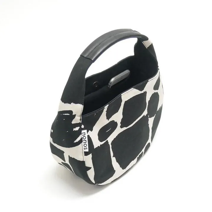 モノトーンの手描き柄はどこか懐かしく暖かみを感じます。そのオリジナル手描き柄プリントの帆布で作られたミニバッグ。バッグの丸いデザインと優しい手描き柄が重なり合い「カジュアルかわいい」バッグが出来ました。ちょっとしたお出掛けに、サブバッグに、気分が上がるミニバッグです。 外側はプリント帆布、内側は無地帆布、外内二重の帆布使いでしっかり自立出来るタイプです。持ち手部分には革を巻き上質感とおしゃれ感をトッピング、汚れ防止効果にもなっています。バッグの口元はマグネット釦付きで閉じる事が出来ます。内側にはマジックテープ付きのポケットとパスケースや鍵を固定出来るDカンが付いています。 いつまでも使い続けて欲しい、変わっていく風合いを楽しんで欲しい、そんな思いから日本製に拘りました。 <サイズ> W : 24cm H : 19cm (持ち手部分は含まない) D : 10cm (底部分) 持ち手の長さ : 33cm 重さ : 約200g <仕様> 本体 : 帆布二重仕立て ハンドル : 革巻き 開閉口 : マグネットボタン 内側 : ポケット(マジックテープ付き)×1 Dカン×1 肩掛け : 不可 B5収納 : 不可 <素材> 表地 : 綿100% 富士金梅 8号帆布 プリント加工(千葉/松戸 FACTORY) 裏地 : 綿100% 富士金梅 8号帆布 持ち手 : 牛革 姫路 LEATHER <縫製> 日本製(東京/ATELIER) ※商品により柄の出方が違う場合があります。 ※濡れたものと強く擦ると希に色落ちする場合がありますのでご注意ください。 ※商品写真はできる限り実物の色に近づけるよう徹底しておりますが、 お使いのモニター設定、お部屋の照明等により実際の商品と色味が異なる場合がございます。