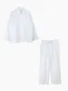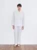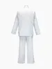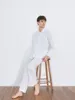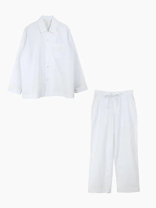 シンプルかつ上品なスリーピング上下セット。 細かいストライプ柄のコードレーン生地は、少し張り感のあるさらっとした肌触りが魅力。 シンプルなデザインでありながら、襟元と袖部分にあしらわれたパイピングが、さりげないアクセントをプラスします。 カラーは、ライトブルーがかった「ホワイト」。