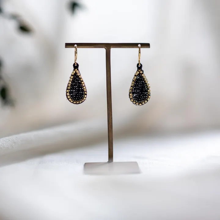 このアクセサリーは、水が落ちていくようなしずく型のモチーフが特徴です。 全体に散りばめられたビーズと中心のスパンコールが揺れるたびにキラキラと輝き、華やかな印象を与えます。 色展開は、どんな服装にも合わせやすいブラックと上品なピンクベージュの3色をご用意しており、様々なシーンに合わせてお楽しみいただけます。特別な日やカジュアルな日常使いにも最適なアイテムです。 曲ビーズを1粒1粒丁寧に縫い留めているため、万が一、ビーズがほつれてしまっても他のビーズが崩れることはありません。この技術があるため、デザインの美しさと耐久性を両立させ、長く愛用いただける品質を実現しています。
