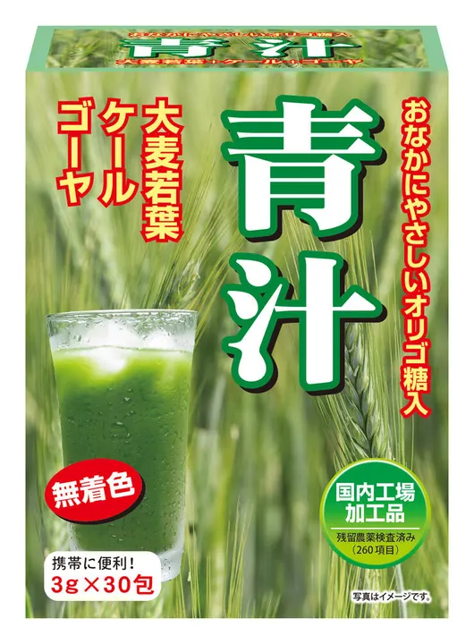 栄養たっぷりの土壌で育った大麦若葉を使用。さらに、おなかの調子を整える「オリゴ糖」、野菜の王様ともいわれる「ケール」、栄養価の高い「ゴーヤ」をブレンド。食品としても人気があり、生野菜に比べて簡単に手軽に栄養を摂取できるなどの利点で評価も髙い商品です。   【お召し上がり方】 食品ですので特に定めはありませんが、1日1~2包を目安に[1回分3gを100~150cc程度の水または牛乳等(炭酸以外)の飲み物によく混ぜて] お召し上がりください。 市販のシェーカーを使いますと、よく混ざります。                    粉末のままお召し上がりいただくと、のどに詰まる恐れがありますので、必ず水または飲料に溶かしてお召し上がりください。