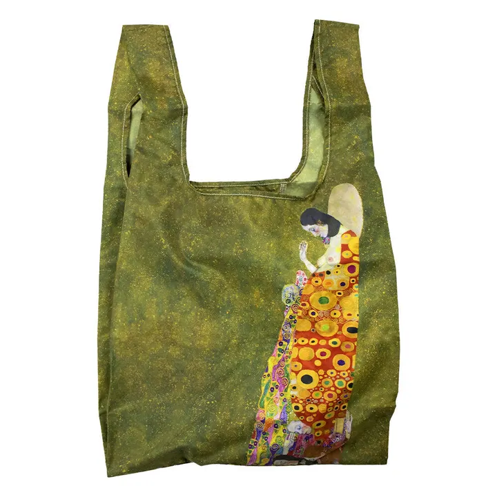 オーストリアを代表する画家クリムトが1900年代初頭に描いた「HopeⅡ(希望Ⅱ)」。落ち着いた色合いがクールな一枚です。 ミュージアムコレクション 美しさと時代を超越した価値を考慮して慎重にセレクトされた作品が、100%ペットボトル再生生地に鮮やかにプリントされています。 風景画から浮世絵までテイストの違う9柄から、自分にぴったりの一枚を見つけてください。 ミディアム 100%ペットボトルを再生した生地を使用したエコバッグ。ミディアムサイズは、約6本のペットボトルからできています。 肩に掛けて持つことができ、どんなシーンにも活躍する大容量サイズ。 カインドバッグの特徴の一つが、ユニークでおしゃれなデザインです。カラフルな色使いやユーモラスなデザイン、女性だけでなく、男性にお勧めの柄まで幅広くラインナップ。お気に入りのお買い物バッグなら、きっと毎日のお買い物も楽しい時間になるはず。 サイズ 約 W39 ×H64 ×D17 39 cm 重量 約 50 g 素材 ポリエステル(リサイクルPET素材100%) 耐荷重 約 20 kg 洗濯 洗濯機OK(30度まで) 漂白剤などの使用、タンブラー乾燥はしないでください。 注意 ※折り畳んだ時の柄の出方は商品によって異なります。 ※商品写真はできる限り実物の色に近づけるよう徹底しておりますが、 お使いのモニター設定、お部屋の照明等により実際の商品と色味が異なる場合がございます。