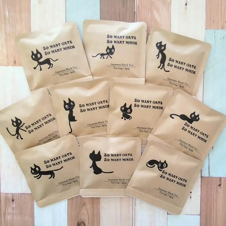10種類の猫パッケージ・和紅茶ティーバッグ(3g×2P) so many cats, so many minds.=十人十色 「みんな違って、みんな良い!」そんな顔をしているカラフルな目の猫ちゃんが10種類のパッケージ。プチギフト、お配りギフトにおすすめです。 茶処・静岡県掛川市産 和紅茶ティーバッグ 3g2個入り。 和紅茶とは・・・日本国内で生産・加工がおこなわれている紅茶のこと。日本ならではの高い技術が生かされた上品な味わいが特徴。優しい香りでほのかな甘みを感じられます。食事の時や日常のお茶として気軽に楽しめる紅茶です。 10柄×3セット 計30袋が1ロットです。 (同じデザインが3袋ずつ入ります。中身の紅茶は全て同じです。)
