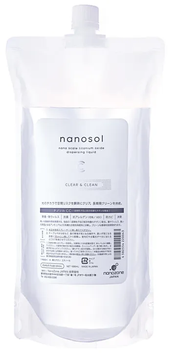 ナノソルCCは自己結合性酸化チタンを原材料とするホームケア製品です。 発売当初、アイラッシュサロン様で、施術時にナノソルCCを使用したところ、お客様や施術者のアレルギー反応が激減した!というお声から始まり ・風邪や感染症に罹らなかった(除菌・除ウイルス・抗菌) ・カビが生えにくくなって掃除の頻度が下がった(防カビ) ・嫌な臭いが消えた(消臭) ・アレルギー症状が出にくくなった(アレルゲン付着抑制) ・汚れがつきにくくなった(防汚) などのお声をたくさん頂き、口コミだけで20万本のご注文を頂きました。 水・エタノール・自己結合性酸化チタンというシンプル原料で、小さなお子様やペットのいるご家庭でも安心してご使用頂いております。 ご家庭での色々な活用法をインスタグラム https://www.instagram.com/nanosol_life/ で紹介していますので、ぜひご覧になってください。 ■容量 1000 mL ■使用方法 ・生活空間 壁、床、カーテン、マット、不織布、テーブル、キッチン、浴槽、トイレなど 噴霧面の素材を選ばず悪影響を与えることなく、人体にも環境にも優しく安全、安心してご使用頂けます。 ・屋外でも お出かけ前に衣服やマスクにひとふき。 持続的な除菌・抗菌作用に加え、花粉・PM2.5など、アレルギーの原因となる微細物質の付着を抑制します。 ・ペット用品のケアに ペット用ケージ・トイレ等の衛生管理、臭い対策に。 ■全成分 水・酸化チタン・エタノール ■ご注意 ・本品を人体・動物に直接噴霧する使用方法は推奨しておりません。 ・本品は病気の予防を保証するものではありません。