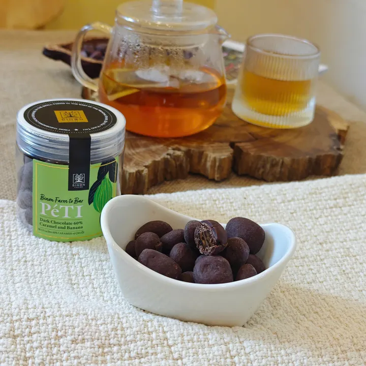 PéTIシリーズはベトナムのフルーツや農産物と組み合わせたチョコシリーズ。保存料や工業用の艶出し剤は一切使用せず、自然な素材にこだわって作っています。 バナナ × チョコレート × キャラメル。 相性の良さをそのまま形にした人気のフレーバーです。 柔らかく仕上げたセミドライバナナに、60%ダークチョコレートとキャラメルを合わせました。 ベトナム産カカオの軽い酸味と、バナナの自然な甘みやコク、キャラメルの苦みと甘さが重なり、一粒でしっかり満足できる味わいです。 バナナのもちっとした食感がグミみたい、おやつにもギフトにも使いやすい仕上がりになっています。