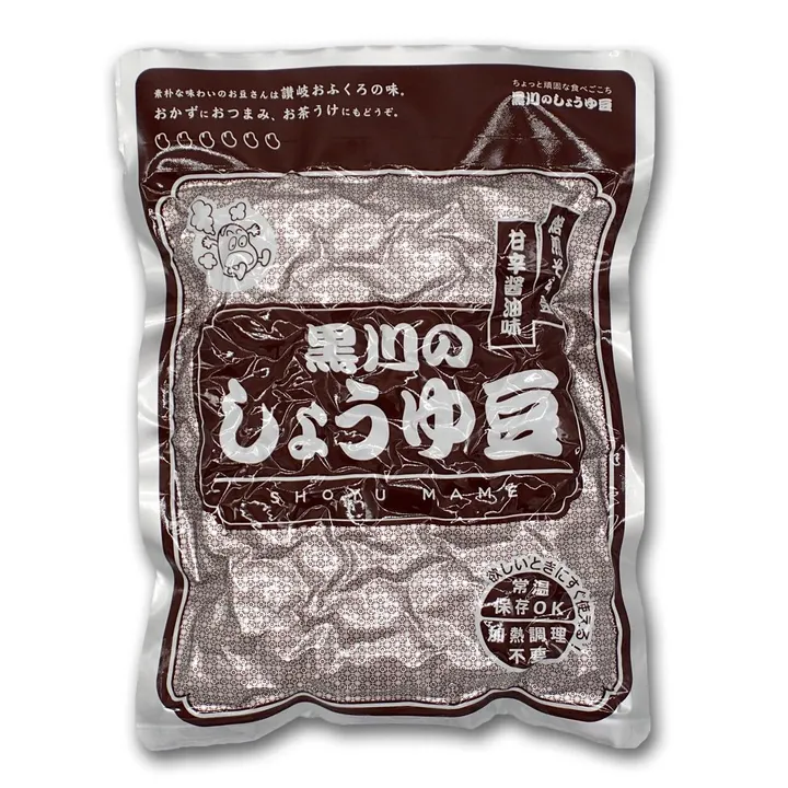 しょうゆ豆とは香川県に古くから伝わる郷土料理です。 乾燥保存したそら豆を弱火でじっくりと焙煎し、砂糖・醤油・唐辛子などで作るタレに漬け込んで作ります。 昔、香川県はそら豆の栽培が盛んでしょうゆ豆もいわゆる”おふくろの味”と言えるものでしたが、近年ではそら豆の収穫量も減り、調理の大変さから家庭で料理されることも少なくなってきました。 食感は煮豆とは異なり、初めて食べる方には少し驚かれます。噛むとぽろっと砕ける歯ごたえは、煮豆よりも甘栗に近いものがあります。 甘辛い醤油のタレが豆の芯まで染み込んでいて、おかずはもちろんお酒のおつまみとしても相性抜群です。 黒川のしょうゆ豆は、調理を機械化し手間を少なく安価に流通できるようにする一方で、家庭料理のぬくもりを感じられるよう昔ながらの製法を大切に製造しています。 使用する原材料は「そら豆・三温糖・醤油・唐辛子」のみ。添加物は使用しません。 保存料なしでも賞味期限は製造から半年。アルミ袋なら1年です。その長期保存を可能にしているのが真空パックと加熱・加圧殺菌の工程です。 さらに、この工程によって豆に均一にタレの風味が染み渡り、程よい歯ごたえの豆にしっかりとした味わいが生まれます。 加熱調理済みですので開封してすぐにお召し上がりいただけます。 常温で長期保存が可能なので、戸棚に常備して忙しい日の食卓にさっと一品追加…といった使い方をされているお客様も多くいらっしゃいます。 そら豆は食物繊維が豊富に含まれています。本品も食物繊維はたっぷり6.9g!(100当たり)腸活としてもおすすめです。 食物繊維は皮にも多く含まれています。食物繊維をとるには皮ごと食べることがおすすめですが、一方で皮が硬くて食べにくいという方もいらっしゃいます。そういった場合はぶどうのように皮をとってお召し上がりください。