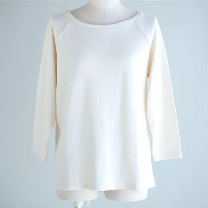 エーゲ海に面したトルコのイズミール地方で栽培された良質なオーガニックコットン100%の生地を使用し、ふわふわの手触りと空気を含んだ温かさが特徴のカットソーです。 2枚の生地をつなぎ合わせて編み立てる接結素材だから、間に隙間があるので空気を含んであったかく接結ならではの存在感のあるぽこぽこした表情も特徴です。 コットン100%なので肌あたりが優しく、よく伸びてストレスを感じない、着心地の良さが、1番の魅力です。 程よい肉厚で、1枚でさらっと着てもいいし、インナーアイテムとして重ね着にもつかえます。 ピタッとなりすぎず、程よく体に沿い肩巾もジャストサイズ。衿ぐりは控えめのポートネック。ラグランスリーブで肩回りがすっきりとして細見え効果。袖丈は作業がしやすい7分丈。