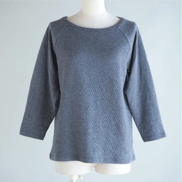 エーゲ海に面したトルコのイズミール地方で栽培された良質なオーガニックコットン100%の生地を使用し、ふわふわの手触りと空気を含んだ温かさが特徴のカットソーです。 2枚の生地をつなぎ合わせて編み立てる接結素材だから、間に隙間があるので空気を含んであったかく接結ならではの存在感のあるぽこぽこした表情も特徴です。 コットン100%なので肌あたりが優しく、よく伸びてストレスを感じない、着心地の良さが、1番の魅力です。 程よい肉厚で、1枚でさらっと着てもいいし、インナーアイテムとして重ね着にもつかえます。 ピタッとなりすぎず、程よく体に沿い肩巾もジャストサイズ。衿ぐりは控えめのポートネック。ラグランスリーブで肩回りがすっきりとして細見え効果。袖丈は作業がしやすい7分丈。