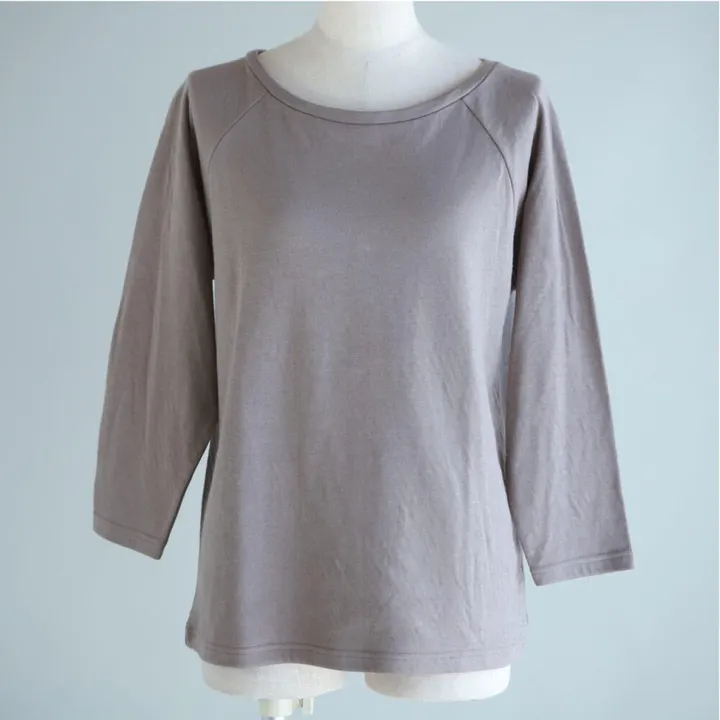 エーゲ海に面したトルコのイズミール地方で栽培された良質なオーガニックコットン100%の生地を使用し、ふわふわの手触りと空気を含んだ温かさが特徴のカットソーです。 2枚の生地をつなぎ合わせて編み立てる接結素材だから、間に隙間があるので空気を含んであったかく接結ならではの存在感のあるぽこぽこした表情も特徴です。 コットン100%なので肌あたりが優しく、よく伸びてストレスを感じない、着心地の良さが、1番の魅力です。 程よい肉厚で、1枚でさらっと着てもいいし、インナーアイテムとして重ね着にもつかえます。 ピタッとなりすぎず、程よく体に沿い肩巾もジャストサイズ。衿ぐりは控えめのポートネック。ラグランスリーブで肩回りがすっきりとして細見え効果。袖丈は作業がしやすい7分丈。