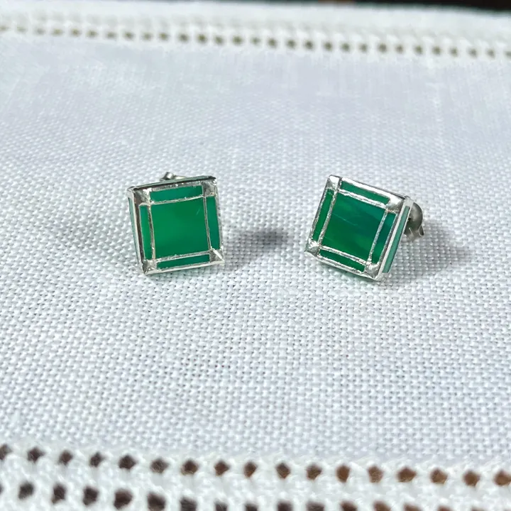 前から金具が見えないタイプのスタッドピアスです。 流れるような濃淡のある、深い海のような青緑色の不透明ガラス。ぬくもりがありながらもかっこいい印象です。 半田部分に繊細な装飾カットを施しており、星のような花のような美しいモチーフ。 半田部分は銀色に輝きます。 ピアスポストは金属アレルギーの起こりにくいチタン製。 ※個人差がございます。 ◇Size: 約 1.0㎝×1.0cm(ガラス部分) ◇Weight: 約 0.9g (片耳) ◇ピアスポスト: チタン ◇キャッチ: チタン ◇鉛フリーの半田を使用しています。