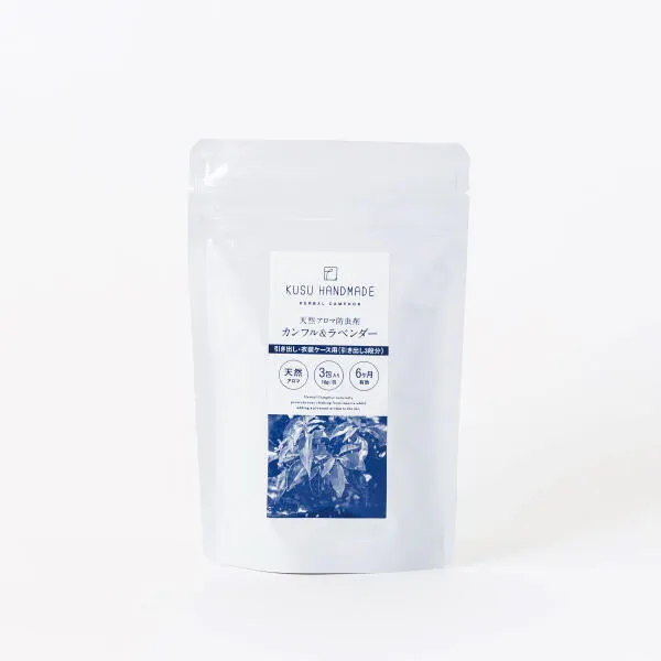 九州産楠から抽出した天然樟脳 楠から抽出した天然カンフルに、国産ラベンダーをミックスしたアロマ防虫剤です。カンフル(樟脳)とは、楠の木部を水蒸気蒸留することで得られる天然の防虫成分です。古くは室町時代から日本で生産され多くの人に親しまれてきました。江戸時代には数百軒あった樟脳屋は、今では日本に4軒のみとなりました。 【生産地】日本 【内袋サイズ】W70×H90mm 【個装サイズ】W110×H170×40mm 【重さ】約38g 【セット内容】カンフル&ラベンダー 10g×3包 【原材料】天然樟脳、ドライハーブ ラベンダー