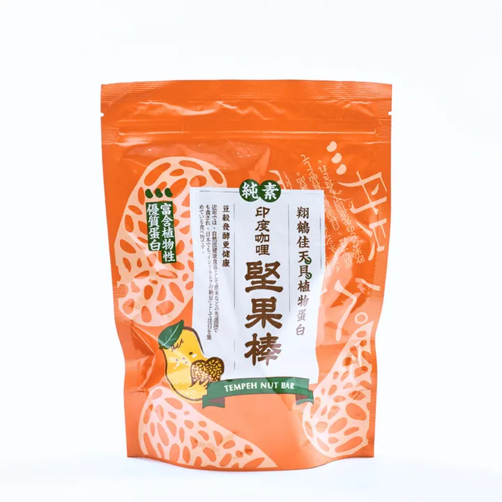 砂糖不使用・無添加、やさしいおやつ習慣 白砂糖を使わず、ココナッツ花蜜のやさしい甘さだけでほんのり仕上げました。 サクッと軽くて、噛むほどに広がる香ばしさとやさしい甘み。 甘すぎず、口どけもスッキリ。仕事の合間や、お茶の時間にもぴったり。 「ちょっと一息つきたいとき」「何かつまみたいとき」に手が伸びる、素朴で満足感のあるスナックです。 スパイス香る、食欲そそるカレー風味 6種のスパイス??ターメリック、クローブ、マスタードシード、唐辛子、ブラックカルダモン、ローリエ??を絶妙にブレンド。 テンペのやさしい旨みと重なり合い、噛むほどにスパイスの奥行きが広がります。 甘くないヘルシースナックをお探しの方にもぴったり。午後のひと息や軽食代わりにも満足感のある、“しょっぱい系”のおやつです。 日本初、14種豆穀×発酵。腸まで届くやさしさを 黄大豆、黒豆、小豆、レンズ豆など14種の豆と穀物をテンペ発酵。 発酵の力で栄養が目覚め、消化しやすく、からだにやさしいかたちへ。 食物由来のたんぱく質や食物繊維、ミネラルも自然なままに。 テンペの伝統に、日本ではまだ珍しい多種豆発酵をかけ合わせた、翔鶴佳(ショウカクカ)だけの“腸にうれしい”素材です。 グリーンバナナのやさしい甘さ、からだにうれしい間食 ほんのりとした甘さは、砂糖ではなくグリーンバナナ由来。 バナナが完熟する前の若い実には、難消化性でんぷん(レジスタントスターチ)が豊富。 腸内の善玉菌のエサとなり、腸内環境を整えてくれるうれしい食材です。 血糖値の上昇をゆるやかにし、自然な満足感も。からだにやさしい、毎日のおやつにどうぞ。 台湾名物「方塊酥」を思わせる、サクッと軽い食感 ひとくち頬ばると、サクッと崩れる軽やかな食感。 台湾の伝統菓子「方塊酥(ファンクァイスー)」を思わせるその口当たりに、テンペ由来のやさしい旨みとほんのり甘さが重なり、心までほっと和らぎます。素材にこだわった素朴なおいしさは、大切な人へのギフトにもぴったり。 海外でも注目される台湾の食文化を感じられる、からだにうれしい「新しいおみやげ」としてもおすすめです。