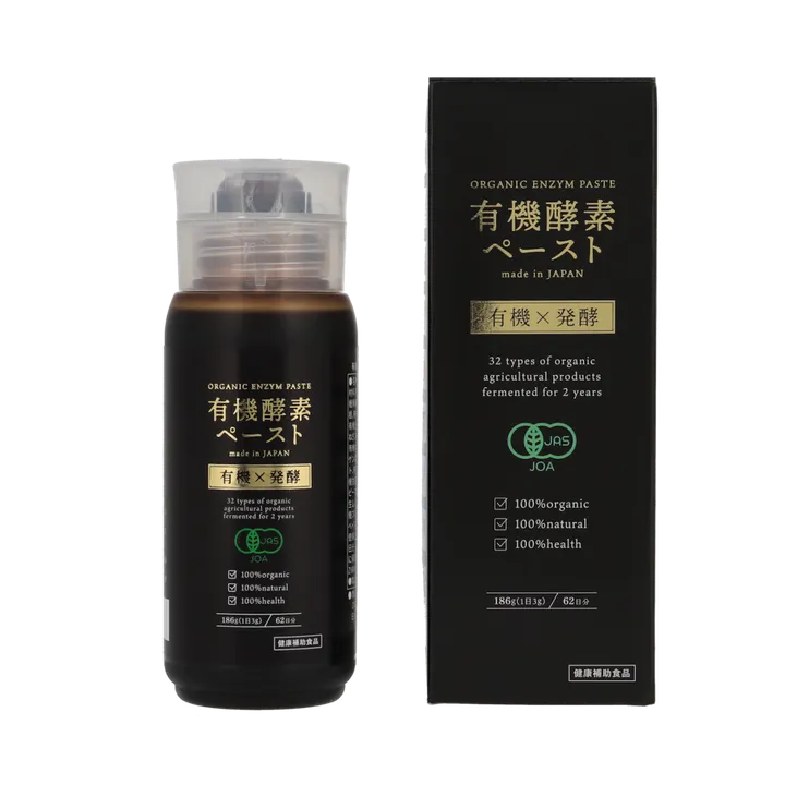 有機JAS認証取得の32種類の国産有機農産物を2年間発酵させて作った有機植物発酵エキスと有機プルーンエキス、有機アガベイヌリンのみを使用した完全無添加の有機酵素ペーストです。 オーガニック原材料100%で、白砂糖・人工甘味料・防腐剤・増粘剤不使用。 非加熱タイプで、子供から大人まで安心してお召し上がりいただけます。 菌活・腸活・ダイエット・オーガニック志向の方におすすめ。 186g(約62日分)。 保存は直射日光・高温多湿を避けてください。