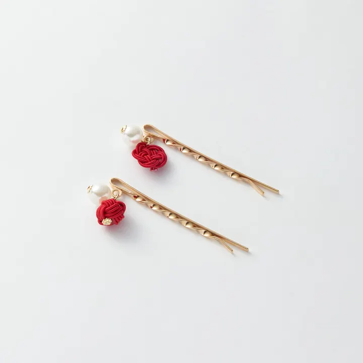 伝統の結びを纏う、格調高き小玉ヘアピン 古来より縁起の良い結びとされる水引。その繊細な技を極めた「小玉」が、気品ある輝きを放つヘアピンとなりました。 控えめでありながらも、格式と美を兼ね備えた佇まい。髪に添えるだけで、装いに品格と趣をもたらします。 格式ある和装から、洗練された洋装まで調和する気品を備えた逸品です。 雅やかさと静謐な美しさを宿した、特別なヘアピン。 日常の装いに、そして晴れの日に。日本の伝統が織りなす優雅な輝きをお楽しみください。