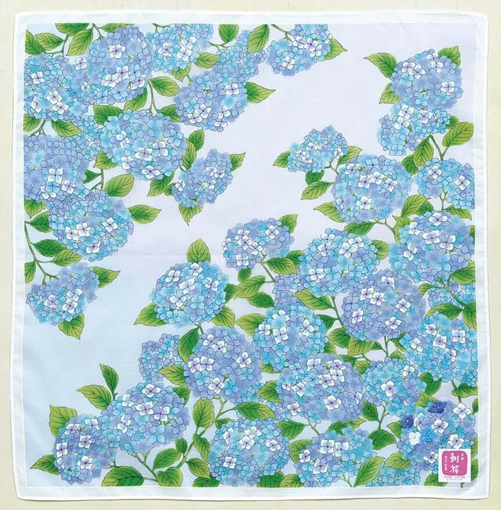 友禅刺繍 ハンカチ「京友禅」は、江戸時代より町人文化と共に受け継がれ、近代では様々な染色技法による表現が見られ、日本における模様染めの代名詞として使われるほど、世界的にもよく知られています。 淡い色彩で柄を切り替えることで、豊かで雅な情緒を表現し、その上に写実的な紋様をあしらいました。ハンカチの右下にワンポイントの刺繍を施した、日本の美しいハンカチです。 ハンカチに使用した「綿ローン素材」は、薄手でさらっと軽やかな平織の生地。肌触りがよく、高級感がある素材です。 紫陽花(あじさい)梅雨の季節を代表する花「紫陽花」。その歴史は古く、日本最古の和歌集「万葉集」にも「味狭藍」として登場します。土壌により青・紫・赤と花の色が変化し、豊富な色味が魅力的な日本を代表する花です。そんな紫陽花の魅力を、一枚のハンカチに表現しました。