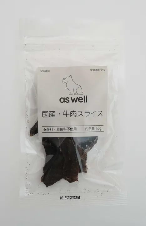 「ペットは家族の一員。だからこそ、素材の美味しさにこだわったおやつを届けたい。」 牛肉スライスは、国産の牛肉を薄くスライスし、無添加・無着色で仕上げました。 ・保存料・着色料を使わず、素材の風味をいかしました。 ・国産牛肉100%:厳選された国産の牛肉を使用しております。 愛犬がよろこぶ、美味しさにこだわったおやつです。 ぜひお試しください! <原材料名> 牛肉 <原産国> 日本 <販売者> B.I.S株式会社 <内容量> 50g <保存方法> ●直射日光や高温多湿の場所をさけて保存してください。 ●常温に放置すると変色しますので、開封後は必ず封をして冷蔵庫で保存し、賞味期限にかかわらず早めにお与えください。 <成分分析値> 粗タンパク質 65.0%以上、粗脂肪 10.0%以上、粗繊維 1.0%以下、粗灰分 5.0%以下、 水分 18.0%以下、エネルギー(100g当たり)380kcal <給与量目安> 1日当たりの給与量(目安) 超小型犬(5kg未満):5〜15g 小型犬(5〜10kg):15〜20g 中型犬(10〜20kg):20〜30g 大型犬(20〜40kg):30〜40g <ご注意> ●本品は愛犬用おやつです。他に流用しないでください。 ●生後6ヶ月未満の幼犬には与えないでください。 ●子供が愛犬に与える時は安全のため、大人が監視して与えてください。 ●愛犬の食べ方や習性によっては、のどに詰まらせることがありますので、必ず観察しながらお与えください。 ●また新鮮な水も一緒にお与えください。 ●本品は、色、形に若干の違いがあります。場合によって製品表面に白い粉がふく場合がありますが、これはアミノ酸の結晶ですのでご心配はありません。 ●品質保持のための脱酸素剤は食べられません。 ●お子様、ペットのふれない所に保管してください。