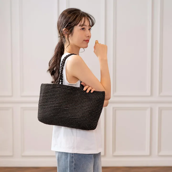 軽くて出し入れしやすい ハンドクロシェの横長トート BK(ブラック)