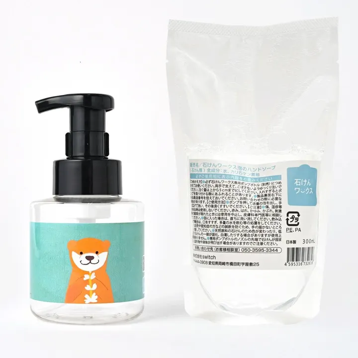 ● 石けんワークス 無添加泡のハンドソープ つめかえ用 300mL 【全成分】水、カリ石ケン素地 【容量】300mL 【寸法】200 × 120× 40(h×w×d/mm) 【重量】309g 【パッケージ材質】 PE、PA 【製造国】日本 【商品特徴】 ・ 泡切れよく少ない水でキレイが簡単!サッパリとした使用感でヌルヌルせず少ない水でキレイが簡単。キャンプやバーベキュー、アウトドアにもおススメ。石けんワークスのハンドソープは生分解性※に優れているので、環境にも優しい。  ※水と炭酸ガスに分解されます ・石けんワークスのハンドソープは、純石けんと水だけでできています。手荒れが気になる方だけでなく、小さなお子様、全ての肌質の方におススメです。 ・石けんワークスのハンドソープは、水と石けんだけでできています。この水は超微細なフィルター(RO膜)をとおした純水を使っています。また、防腐剤を添加せずに品質を保つため、80℃で30分間加温、さらには製造後に菌検査を実施、在庫も定期的に品質確認を実施しています。 ● 石けんワークス泡用ポンプ容器 【原料樹脂】ポンプ材質:ポリプロピレン、ポリエチレン / ボトル材質:PET 【容量】300mLサイズ 【寸法】151×76×76(h×w×d/mm) 【重量】75g 【製造国】日本 【商品特徴】 ・ワンプッシュごとに豊かな泡立ちの石けんが吐出されます ・スムースで滑らかな押し心地 ・中身が見える透明ボトル ・ブラックカラーのポンプヘッド 【デザイン】 花に想いをこめてシリーズ ・ブルー - ペンギンさんとピンクデイジー ・グリーン - カワウソさんと白いルピナス ・オレンジ - くまさんと赤いゼラニウム (イラスト作家:chihiro 作 )