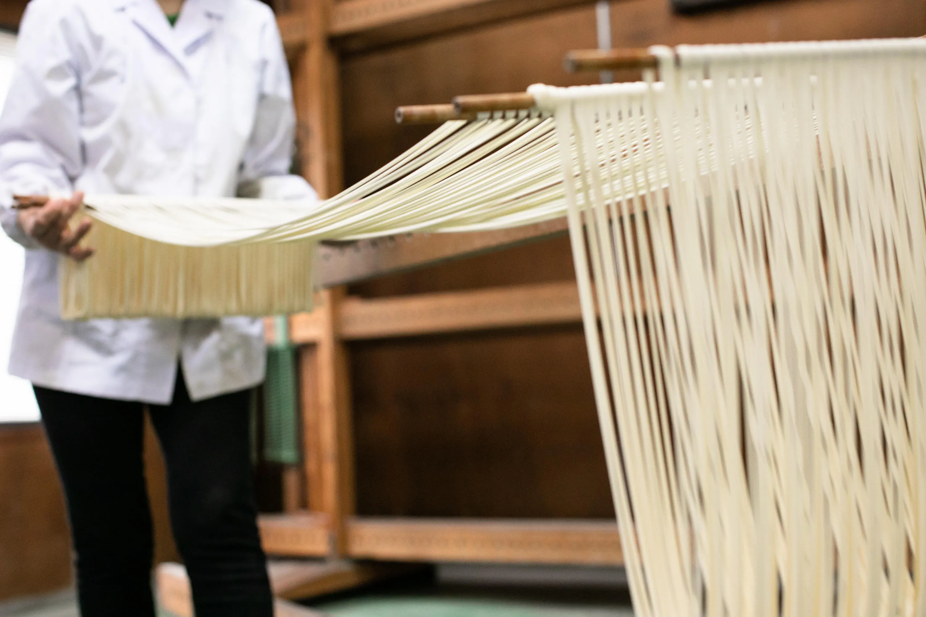 我們之所以持續走這條路,是因為世代相傳的美味麵條心態。 這種製造方法無法透過大量生產生產,毫不留情地生產。 麵團經過細微調整溫度與濕度,同時微調小麥、水和鹽等簡單材料,然後隨時間乾燥。 這些麵條需要兩天才能完成,充滿了我們「想著吃它們的人微笑的感覺」。
