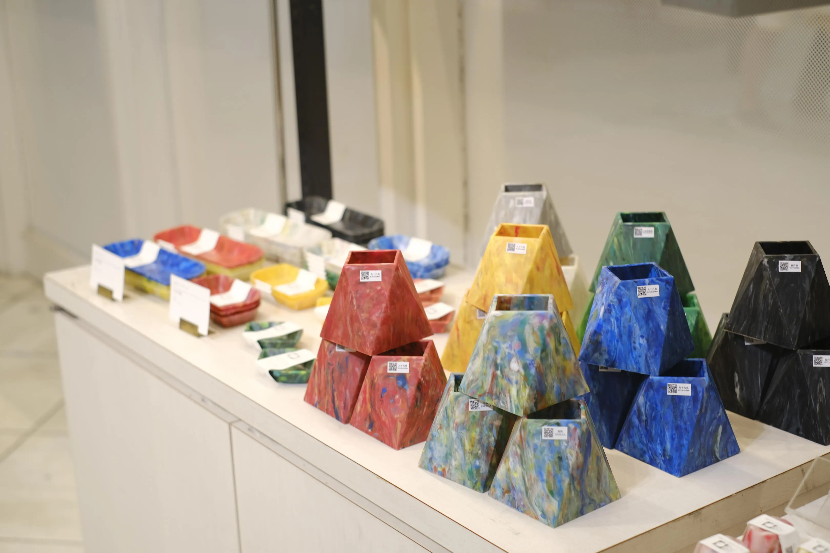 [海洋塑膠廢棄物,幾乎100%成分製成的產品] 透過獨特的造型方法,每件垃圾都有不同的顏色和花紋,同時保留原本的顏色。
