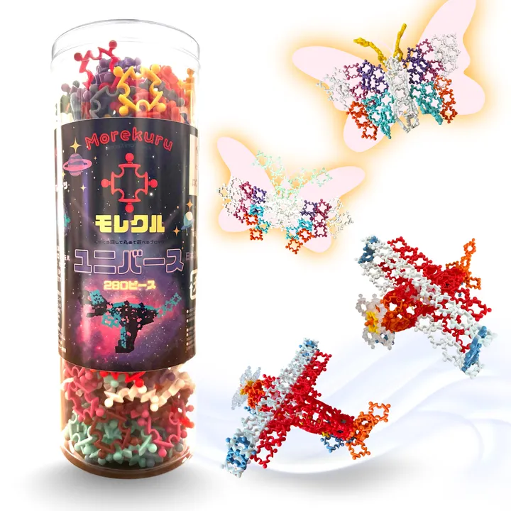該分子是一個單一形狀的部分,靈感來自「分子結構」。 組裝的積木玩具。 與其像傳統的磚塊一樣重新組裝零件, 它完全不同,因為「彎曲、扭轉、轉動」在同一個形狀下 最大特點是它會變形。 憑藉這種獨特的結構,從平面到三維,更多生物與載具, 現在可以表達無限多種表達式,包括抽象形狀。 此外,在演奏時,該分子自然發展出想像力和空間感知能力, 它培養創意,適合從兒童到成人的各代人享受。 它是設計好的。 你可以製作各種東西,比如發光的恐龍和燈籠。 宇宙內容 280件附有說明的作品 (白色、黑色、紅色、藍色、黃色、綠色、紫色、棕色、粉紅色、灰色、橘色、薄荷色、淺藍色、磷光色)14種顏色(每色20件) 年齡 5 歲及以上