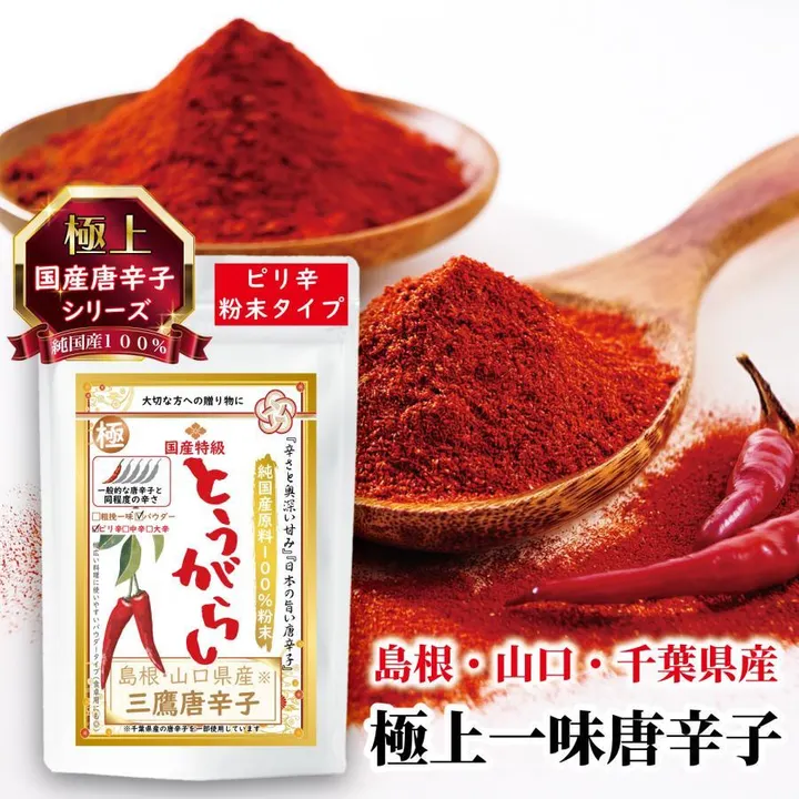 【食材/食材】辣椒(千葉縣山口縣島根市) 【內容物】20g×1 袋 [保存期限] 365天 【產品資訊】 [100%純國產辣椒] 三鷹辣椒,香氣濃郁,鮮味濃郁,辛辣十足。 味道濃郁,為料理增添濃郁感! [三種辣度等級可選] 你可以選擇辣、中辣和非常辣! 用你最愛的辣味為料理增添活力! 【兩種:粉狀和粗磨】你可以用粉狀和粗磨型來配合你的料理! 【粉末特徵】鮮味和辣味瞬間擴散! 推薦用於炒菜、咖哩和湯品。 【粗磨型特徵】風味和辣味會逐漸發展出來! 推薦用於烤雞串、披薩和牛排。 【粉末+粗磨與深辣】結合兩種,可以創造出溫和且深辣的風味! [無添加物,無鹽] 你可以品嘗食材的原味! 市見辣椒,可以安全地用於日常餐點。 從內到外溫暖你的身體! 這是寒冷季節的完美調味料。 [完美送禮◎] 最優質的辣椒,烹飪愛好者和特別場合禮物都會喜愛!
