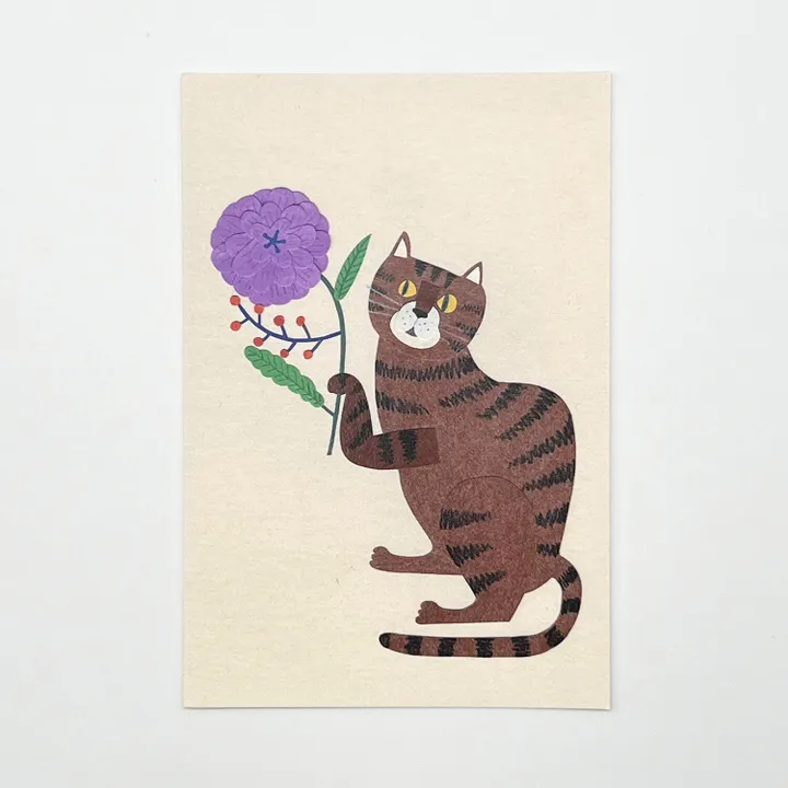 「虎斑貓與花朵」 佐藤明子著 這是一張由愛貓創作者繪製的明信片,造型靈感來自貓咪的喜好。 你可以把它放在房間裡,當作賀卡送,或作為禮物附上訊息卡。 ♪ 找到你「最喜歡的貓咪」。