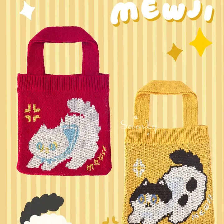 [2026春夏新品發表] 貓臉貓圖案針織手提包「MEWJI 喵呻」2色可選 ☆ 時尚 |*你可以選擇顏色(訂購時請在聊天欄聯絡我們)五件套組