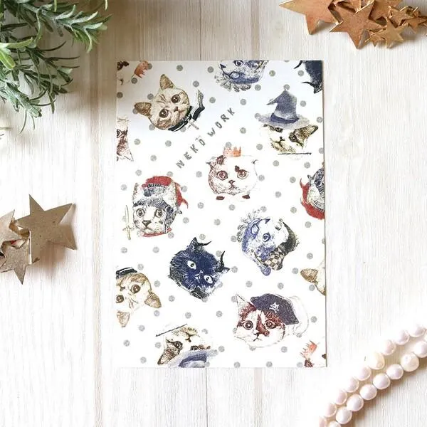 一張有貓咪圖案和灰色點狀圖案的時尚明信片。 請留意每隻進入奇幻世界的貓咪的服裝,以及牠們的職業。 這個設計會讓你光是欣賞就會很享受,所以我們建議你把它擺在房間裡。 [貓][貓][貓][日本製造]【新學期】 貓用品? 可愛的文具附日文插畫 | 日本製造