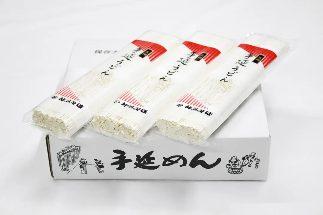 烏龍麵很厚,口感很硬。 因為麵條是乾的,保存時間很長,你還能嘗到順口的口感。 推薦 夏季時,會冷藏並用作沙拉烏冬的麵湯。 冬季則用於鍋煮、烤烏冬和火鍋燉煮(手拉拉伸,即使燉煮也不會煮沸)。